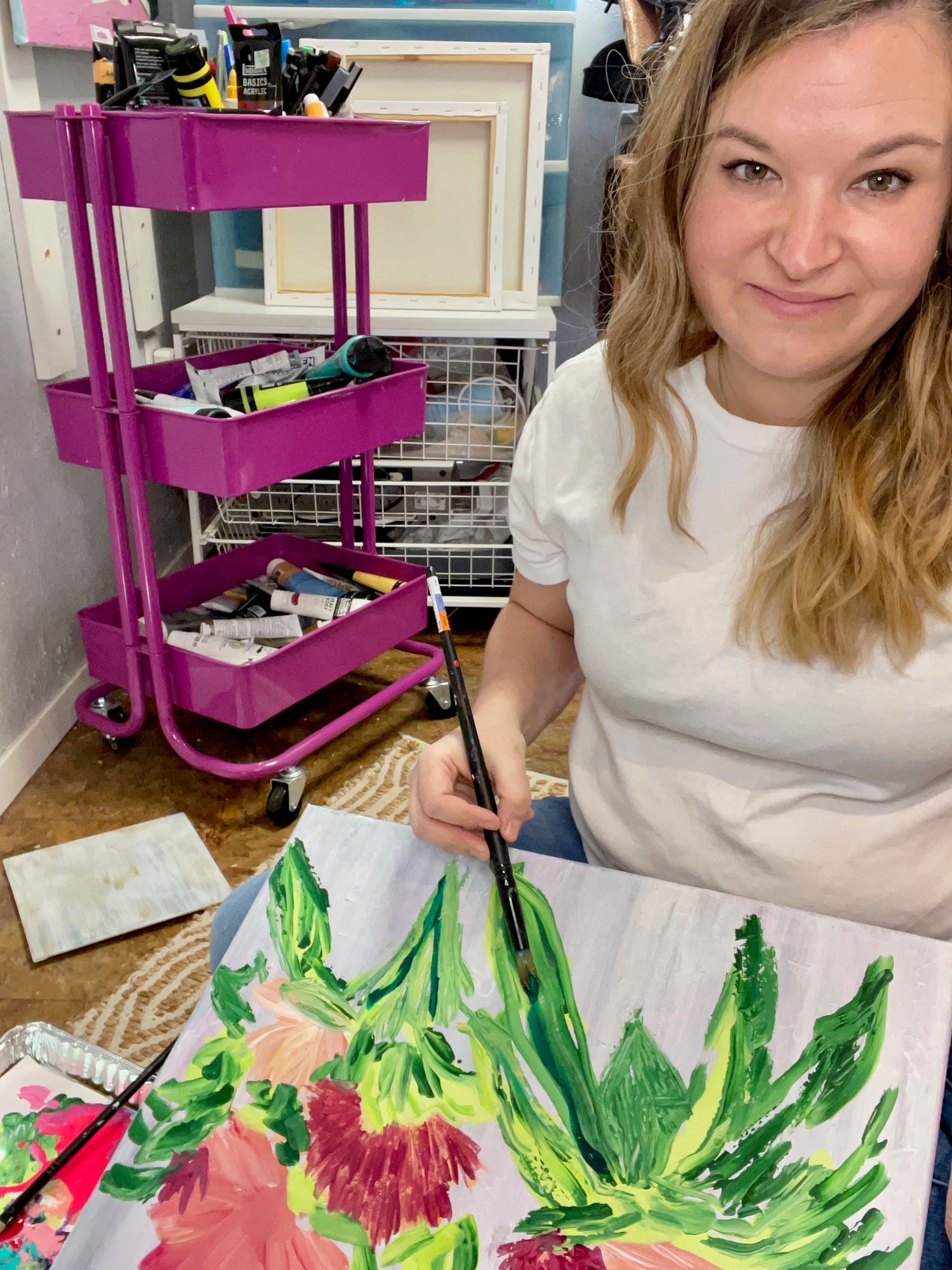 My paintings start with this process inspired by something in my life; a memory from long ago, a meaningful scripture, or a moment from motherhood. Vibrant color schemes, loose florals, and abstract paintings come together in organic layers with expressive details that give a loose representation of their reality. When taking a closer look, there are details of conveyed emotions, mark making, scripture, and incising; creating beauty from the chaos and imperfections of life.